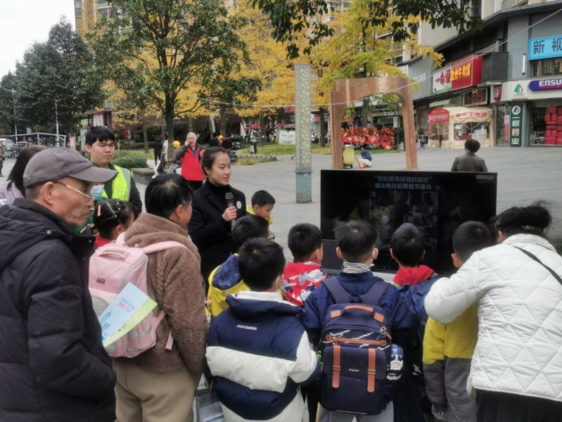 活动现场,家长与孩子们被反诈主题宣传片吸引并驻足观看